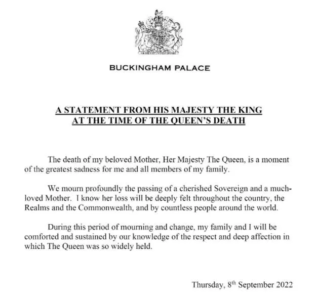 «La muerte de mi amada madre, Su Majestad la reina, es un momento de la mayor tristeza para mí y para todos los miembros de mi familia», dijo en un comunicado.