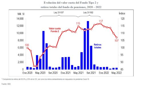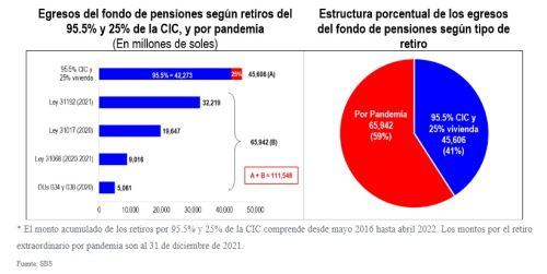 La Superintendencia de Banca, Seguros y AFP (SBS) informó que 111,500 millones de soles salieron de los fondos de pensiones de las AFP con normas para disponer del 95.5% de los ahorros jubilatorios y del 25% para la compra del primer inmueble, así como con los cinco retiros anticipados por pandemia.