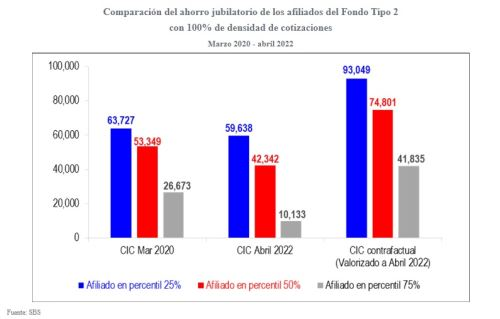 Entonces, los afiliados del Grupo 1 pasaron de tener ahorros de 63,727 soles en marzo del 2020 a 59,638 soles en abril del 2022, pero si no hubieran retirado sus fondos, hubiesen alcanzado una CIC de 93,049 soles, lo que representaba un aumento de 57% de su fondo y no se habría descapitalizado en más de la mitad al cierre de abril 2022, destacó.