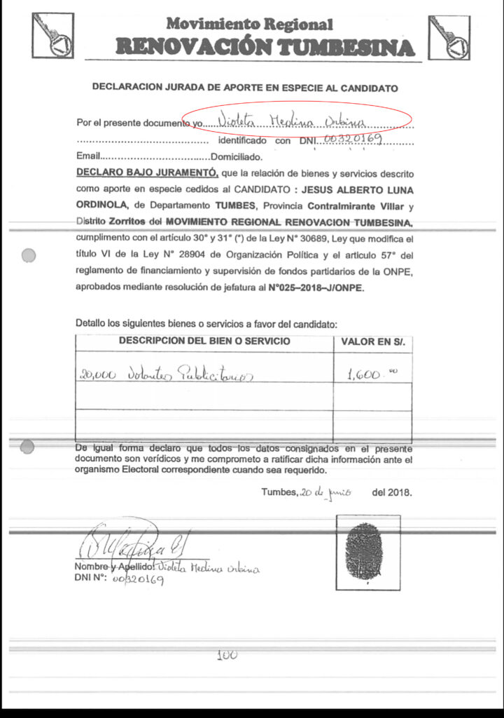 El informe que detalla los ingresos y egresos de la campaña electoral del alcalde Luna Ordinola que fue presentado a la ONPE y en el mismo se documenta que Violeta Medina aportó 20,000 volantes publicitarios valorizados en 1,600 soles, conforme lo acredita el recibo de aportes N° 001-0000012 de fecha 20 de junio del 2018 y la declaración jurada de aporte en especie al candidato suscrita el mismo 20 de junio del 2020 por Medina Urbina.