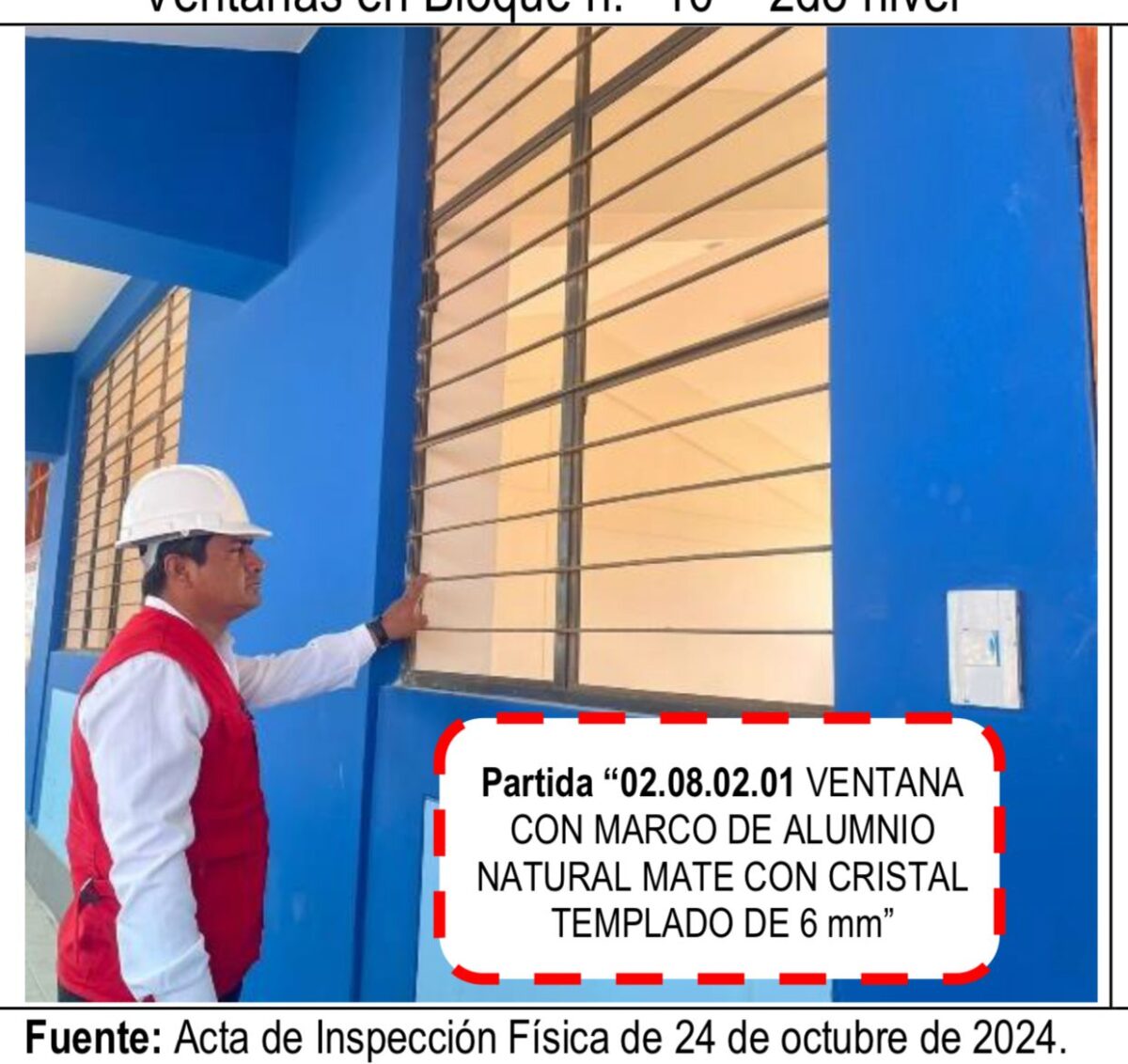 Entre los trabajos pendientes destacan: Ventanas de aluminio con cristal templado de 6 mm, varios bloques aún no cuentan con las ventanas instaladas, incumpliendo las especificaciones técnicas de carpintería metálica establecidas en el expediente técnico.