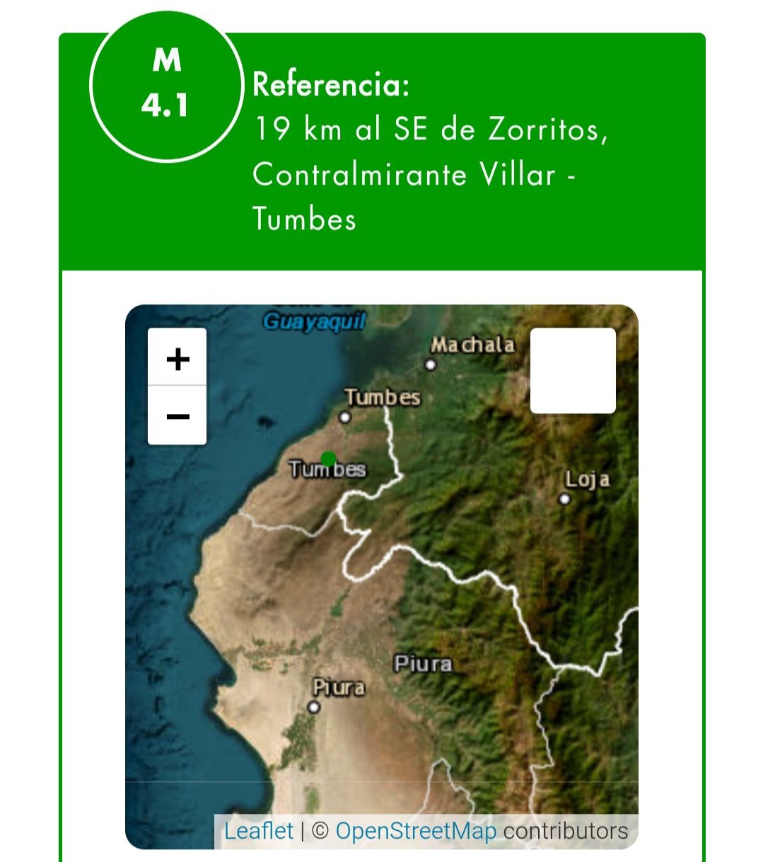El Instituto Geofísico del Perú (IGP) informó que un sismo de magnitud 4.1 se registró el martes a las 11:02 de la mañana, con epicentro a 19 kilómetros al sureste del distrito de Zorritos, en la provincia de Contralmirante Villar.