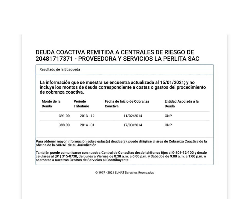 Según consulta realizada por nuestro medio al portal web de la SUNAT, la deuda contraída por la empresa Proveedora y Servicios La Perlita SAC, data de diciembre del 2013 y enero del 2014, ósea hace más de 7 años, que no se paga la deuda laboral.