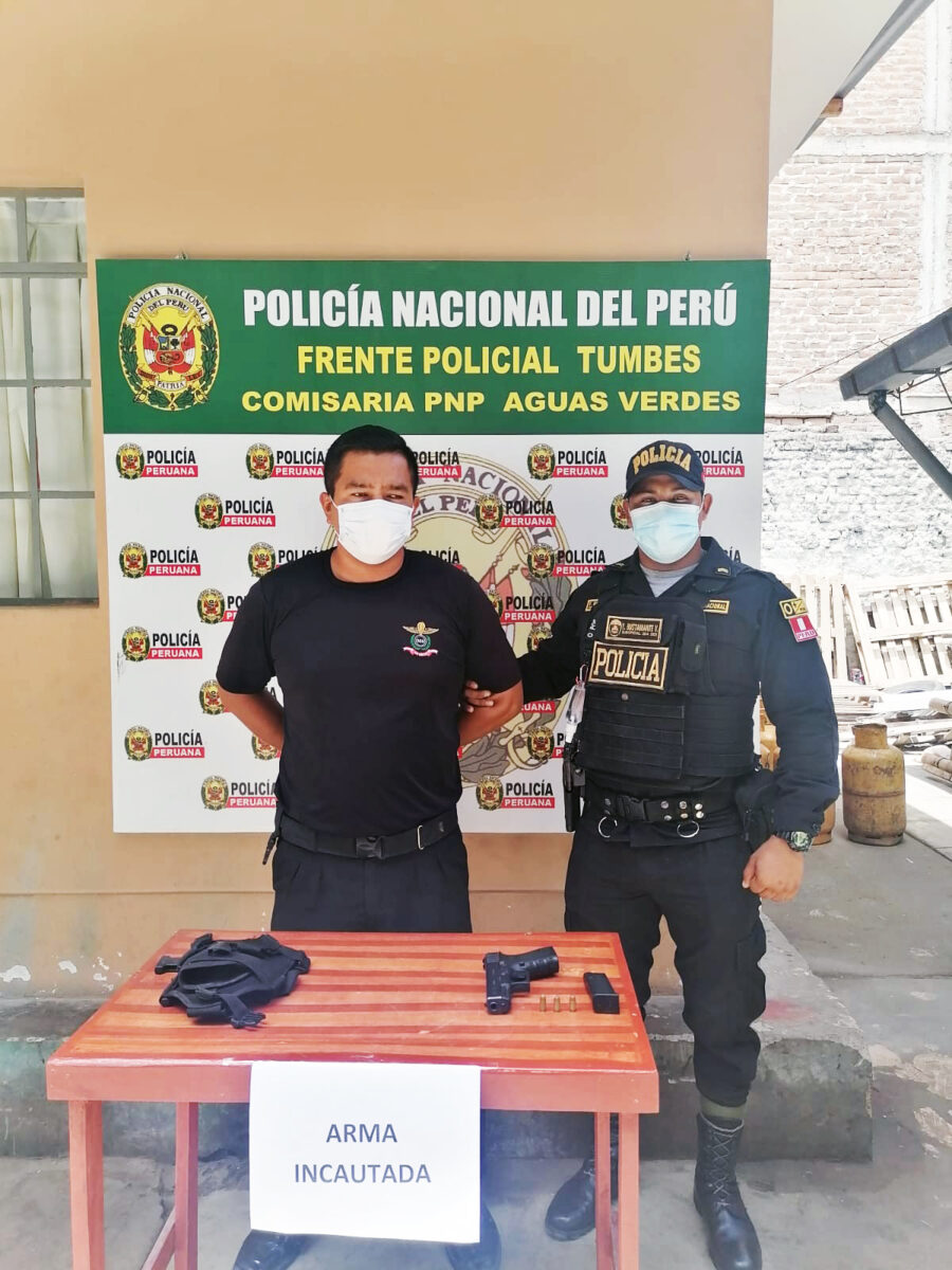 Según fuentes policiales, la intervención ocurrió el último jueves, al promediar las 11:30 de la mañana, en circunstancia que personal policial de la comisaría de Aguas Verdes, en circunstancias que se encontraban de servicio a la altura del Puente Bolsico, se intervino a la persona Erik Alfonso Pongo Berru (31), quien se le observo que a la altura de su muslo derecho llevaba puesta una muslera táctica color negro, que enfundaba un arma de fuego tipo pistola, marca Glock, color negro, con Serie N° WGA763, con una Cacerina abastecida con tres cartuchos calibre 3.80, por lo que se le pregunto si contaba con los documentos respectivos que acredita la portabilidad de dicha arma de fuego, mostrando este una tarjeta de la Superintendencia Nacional de Control de Servicios de Seguridad, Armas, Municiones y Explosivos de Uso Civil – SUCAMEC con fecha de vencimiento 30 de octubre del 2020, manifestando que no contaba con su licencia de portar armas.