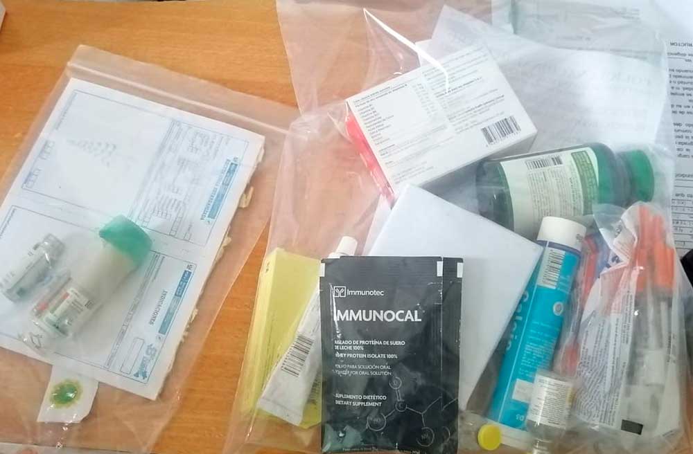 Constatando que llevaba medicamentos consistentes en dos ampollas de Flumisil, dos ampollas de Colismet, ampollas de Quetiopina, uno (01) frasco de vaselina, dos (02) barras de manteca de cacao, que fueron sustraídos al paciente Augusto Urbina Herrera.