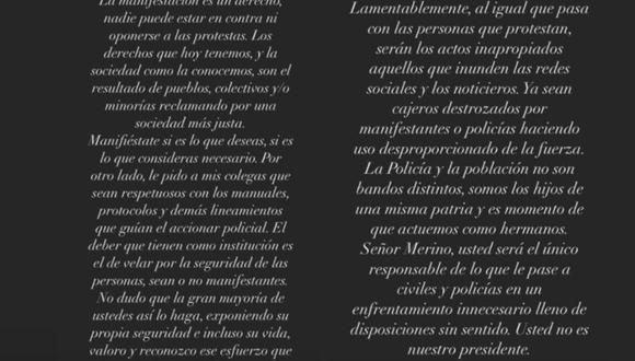 “Le pido a mis colegas que sean respetuosos con los manuales, protocolos y demás lineamientos que guían el accionar policial. El deber que tienen como institución es el de velar por la seguridad de las personas, sean o no manifestantes. La Policía y la población no son bandos distintos, somos los hijos de una misma patria y es momento de que actuemos como hermanos”, escribió en su mensaje la expareja de Jean Deza.