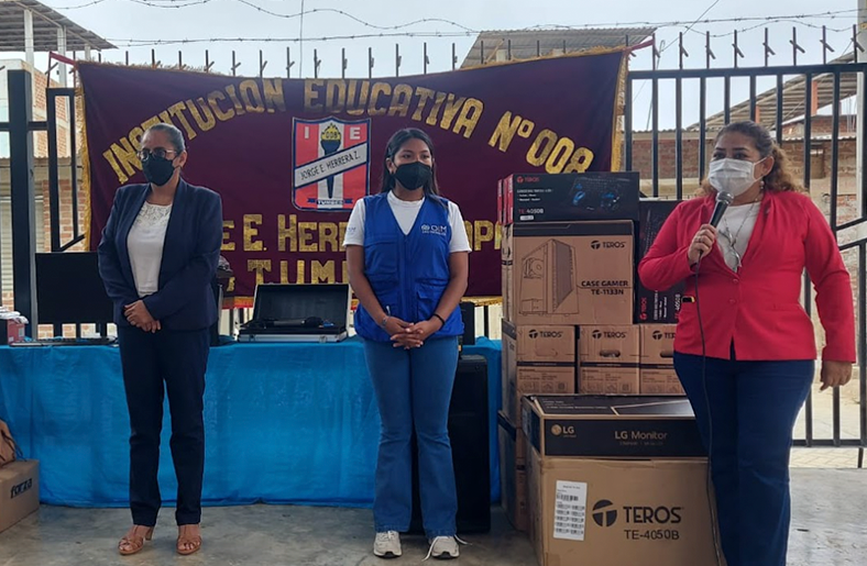 Tras un trabajo coordinado entre la Unidad de Gestión Educativa Local (UGEL) y la Organización Internacional para las Migraciones (OIM), se pudo concretar la entrega de 2 kits de equipamiento tecnológico a dos instituciones educativas, valorados en 24 mil dólares.