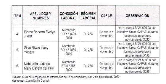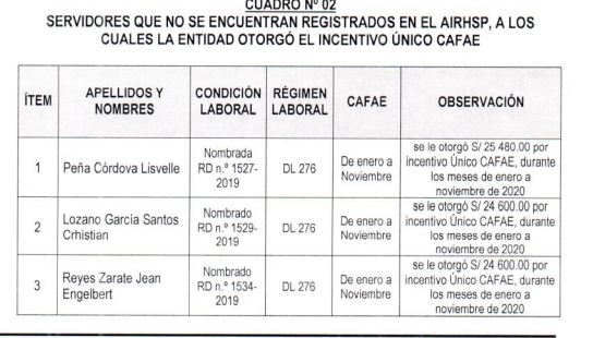La contraloría ha encontrado que seis servidores nombrados que no se encuentra en el AIRHSP, es el caso de Lisvelle Peña Córdova, de enero a noviembre, se le otorgó la suma de S/25,480 por incentivo único de CAFAE, igual situación se encuentra Santos Crhistian Lozano García a quien se le otorgó la suma de S/24,600.