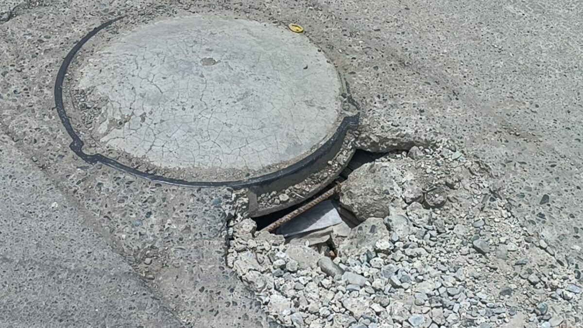 La carretera tiene enormes grietas y tapas de los buzones están rotas