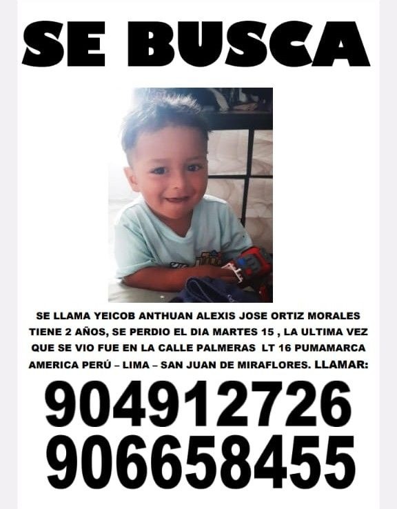 El menor, identificado con las iniciales Y.A.A.J.O.M., se perdió en la calle Palmeras, lote 16, del sector Pumamarca América Perú, en el distrito de San Juan de Miraflores, Lima.