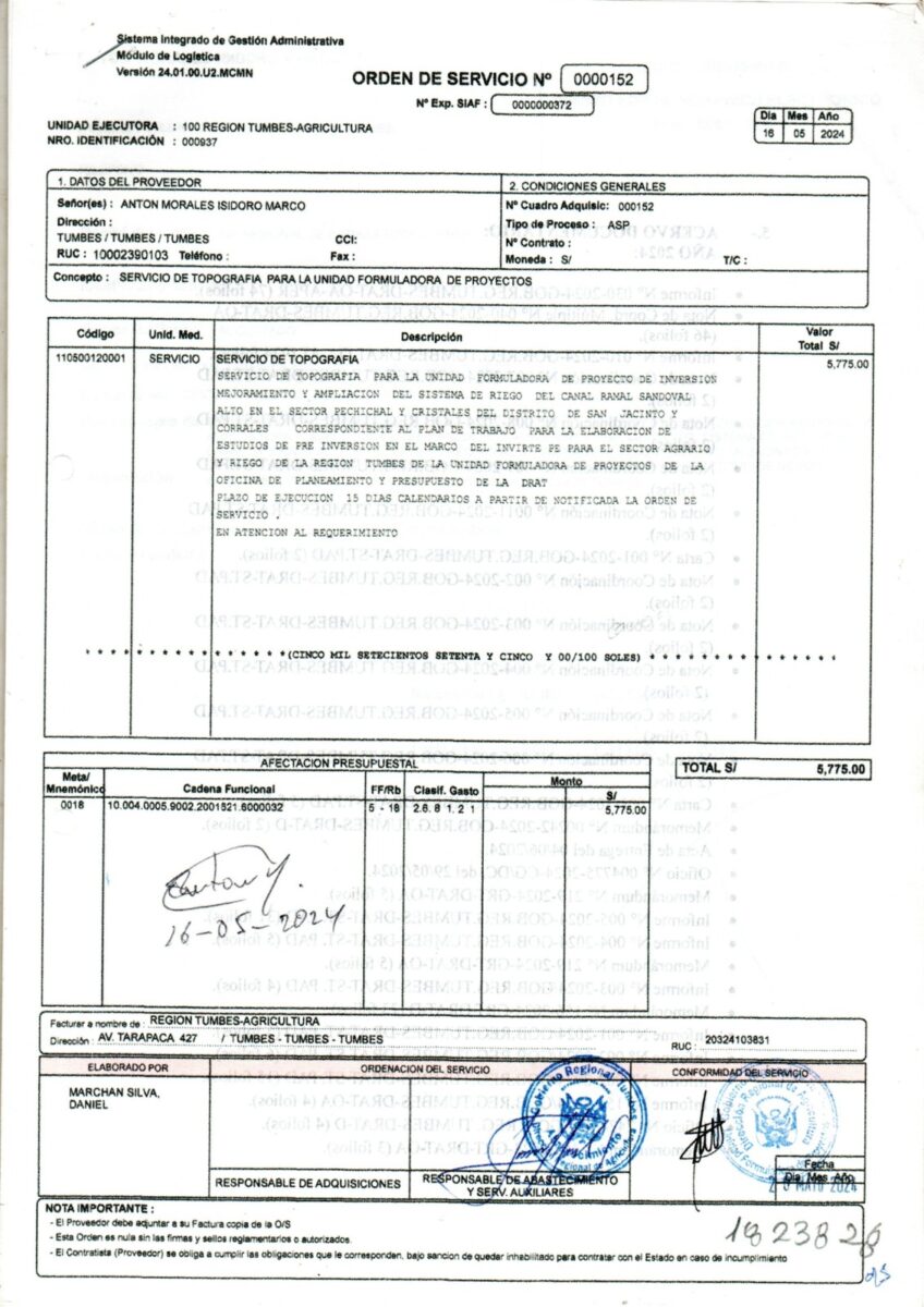 Se ha accedido a información detallada sobre dos órdenes de servicio gestionadas durante su administración: la Orden de Servicio N° 152, correspondiente a trabajos de topografía para el proyecto de «Mejoramiento y Ampliación del Sistema de Riego del Canal Ramal Sandoval Alto» en los sectores de Pechichal y Cristales, por un valor de S/ 5,775.00; y la Orden de Servicio N° 231, por el «Mejoramiento del Sistema de Riego del Canal Ramal Sandoval Bajo», por un monto de S/ 7,500.00.