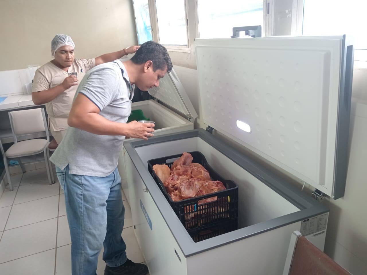 En otra fotografía compartida en la página del Hospital se aprecia como el director con un vaso, al parecer de refresco, se acerca hacia el congelador, donde se encuentra el pollo; sin embargo, lo hace sin su mascarilla o guantes, pudiendo ocasionar una contaminación a los alimentos.