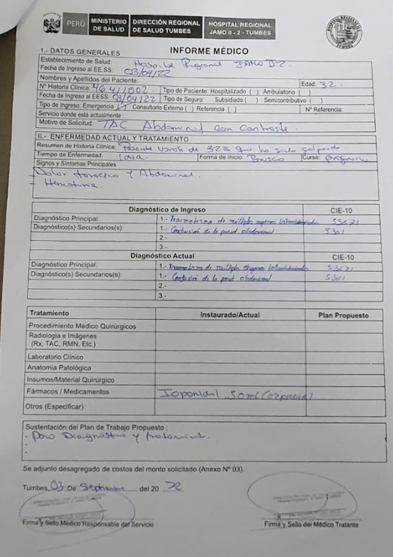 Llenos de impotencia e indignación, desde las instalaciones del Hospital José Alfredo Mendoza Olavarría (JAMO) de Tumbes, los familiares del joven Gerson Valladares Benavides, quién se debate entre la vida y la muerte luego que recibiera una brutal golpiza por presuntos miembros del cuerpo de Serenazgo de la Municipalidad Provincial de Tumbes, hicieron un llamado a través de nuestro medio a las autoridades de nuestra región para que se haga justicia en este caso y los responsables de este terrible suceso ocurrido el pasado 2 de septiembre sean puestos a disposición para que sean investigados según indica la ley.