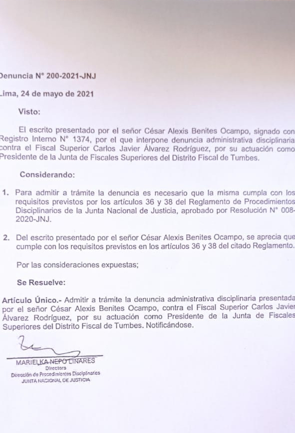La Junta Nacional de Justicia admitió a trámite la denuncia administrativa disciplinaria interpuesta contra el Fiscal Superior Carlos Javier Álvarez Rodríguez, por su actuación como presidente de la Junta de Fiscales Superiores del Distrito Fiscal de Tumbes.