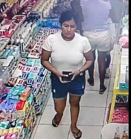 Las cámaras del interior del local registraron a una mujer vestida con blusa crema y short jeans que camina junto a su pequeña niña en las instalaciones del local, donde se puede apreciar que llevaba en sus manos una cajita conteniendo una billetera.