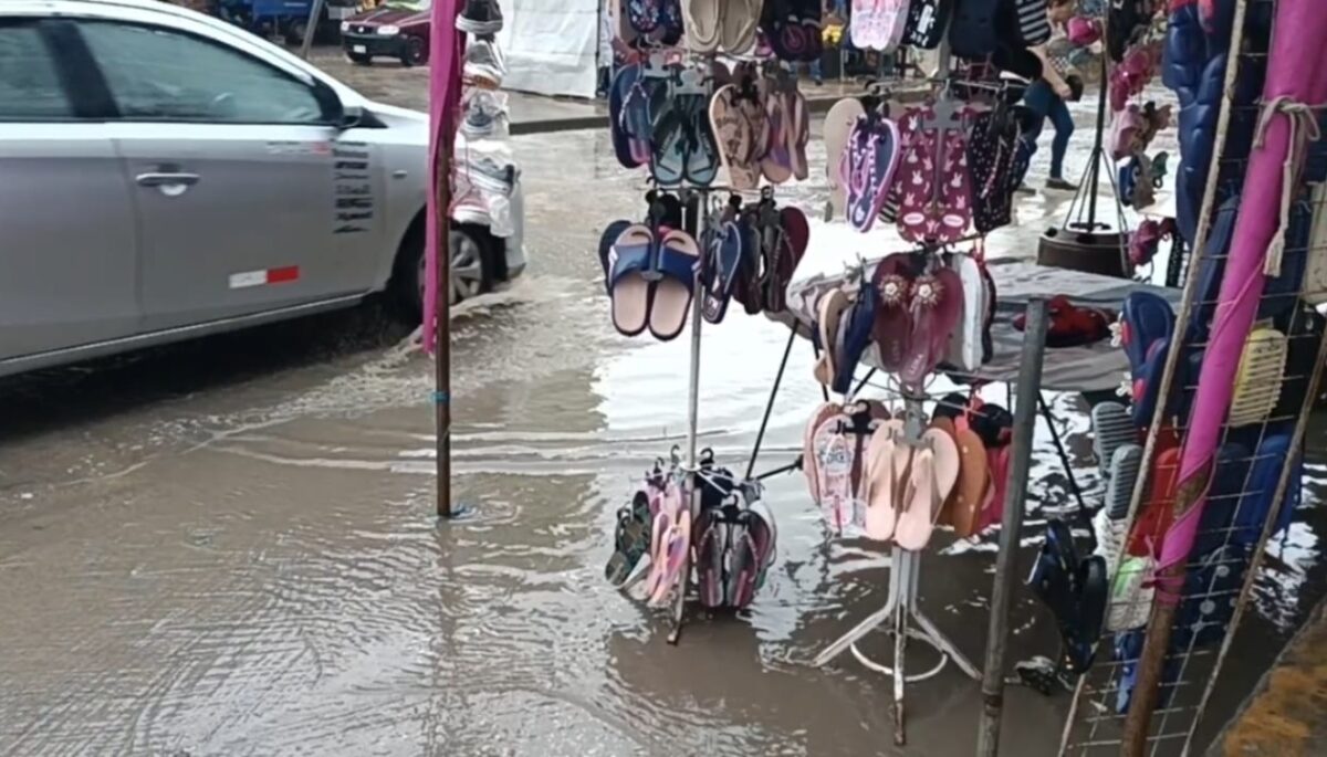 El mercado principal también amaneció inundado y la lluvia de leve intensidad no permitió que los comerciantes saquen su mercadería desde tempranas horas, teniendo que esperar hasta que las precipitaciones pluviales cesen para comenzar las ventas de productos por fin de año.