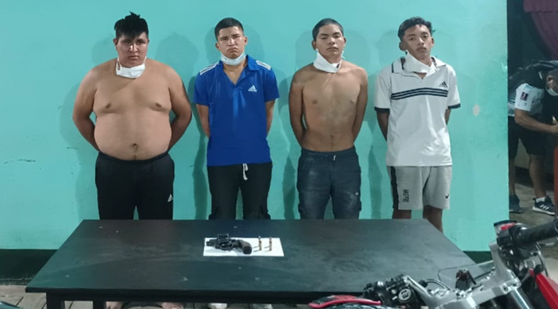 Los agentes del orden lograron detener a Manuel Jesús Tapullima Cayao, de 20 años de edad, alias “Gordo”, Jesús David Cobeñas Ríos (18) apodado “Cachaco”, y los menores de iniciales A. E. T. A (17), conocido como “Payasito”, y E. J. B. B (17), apodado “Colorado”. En esta intervención a este último se le encontró un arma de fuego, marca Smith Wesson, con número de serie B2033485, abastecido con cuatro municiones, color dorado, con las inscripciones 38 especial, sin percutir.